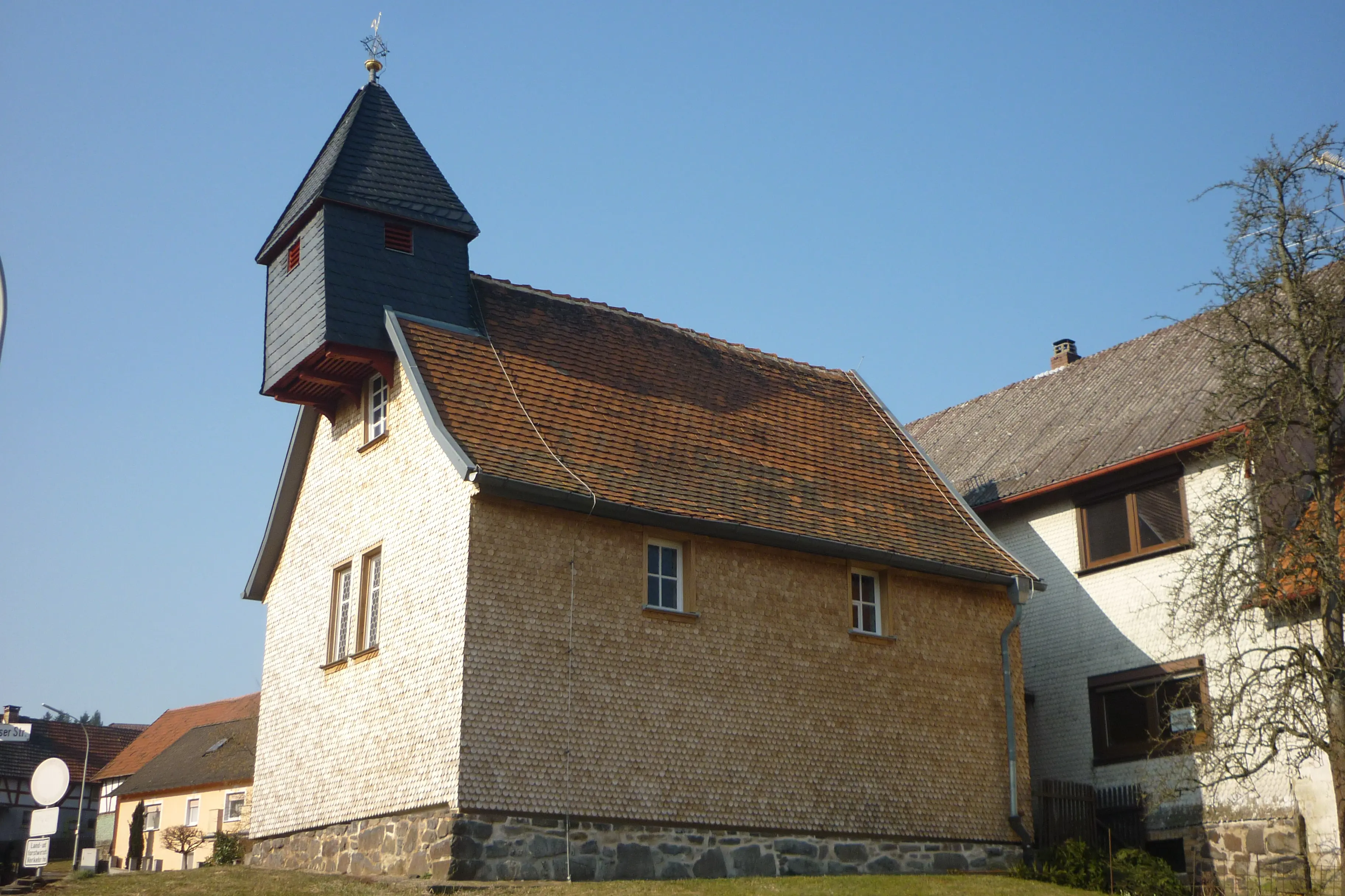Die Kirche ist ein kleiner, reckteckiger, seit der letzten Renovierung ganz verschindelter Fachwerkbau, der nach Südosten ausgerichtet ist und am Zusammentreffen der drei Hauptstraßen direkt in der Mitte des Dorfes liegt. Auffallendstes Merkmal ist ihre ‚Größe‘ – ein deutsches Substantiv ‚Kleine‘ gibt es ja nicht. Die Grundfläche beträgt 6,00 x 8,50 Meter. Sie ist damit eine der kleinsten Kirchen in der Umgebung, doch sie verfügt auch über zwei kleine einbankige Emporen. Wer nun meint, die Kirche könne nicht viele Menschen fassen, lasse sich nicht täuschen: Die Nachrichten über Traugottesdienste mit über 80 Personen in dieser Kirche sind keine Legende.